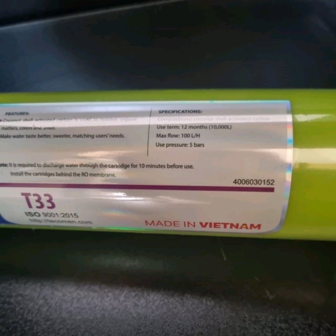 دارای عمر بالا ، Long life . سرویس لایف ۱۰۰۰۰ لیتر دارای کربن نارگیل و کاملا فود گرید لیبل متالایز بسته بندی سلفون شفاف ۱۱ اینچ حذف کلر و بو و طعم آب